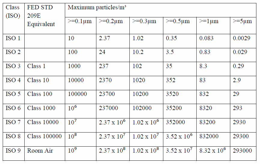 國際標準組織建立了九個潔凈室分類。這些標準被分配了從 ISO 1 到 ISO 9的分類。潔凈室分類基于房間的清潔度。這些分類被分解為每立方米有多少特定尺寸的顆粒,然后被分配一個 ISO 分類。然后根據 ISO 標準分配類。不同的行業需要不同的清潔度和無菌度。