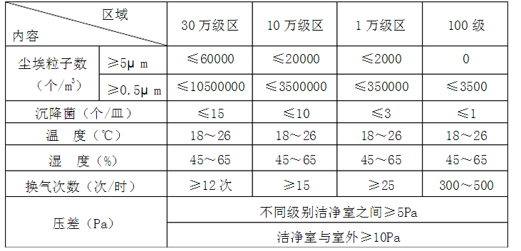 表1  潔凈區環境控制標準