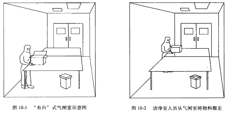 3) 氣閘室充分自凈:讓氣閘室處在無人狀態(tài)下數(shù)分鐘的時間,以便將污染降**這樣 的濃度:當潔凈室一邊的門打開時,潔凈室不會受到大的影響。為實現(xiàn)這一目的,可安裝 內外門的聯(lián)鎖計時裝置或指示燈。當潔凈室側門自動打開或指示燈點亮后,潔凈室的人員 進人氣閘室,拿起物品后離開氣閘室,如圖10-2所示。