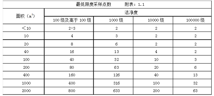 測定潔凈度的**低限度采樣點數按附表1.1的規定確定。每點采樣次數不少于3次,各點采樣次數可以不同。