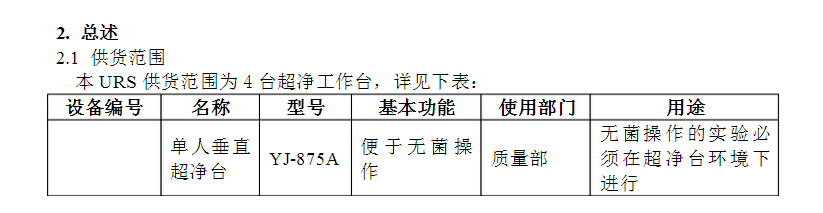 · 本文描述了新購4臺超凈工作臺的URS,用于更換原有的已損壞的超凈臺,使之符合2010年版GMP的要求。